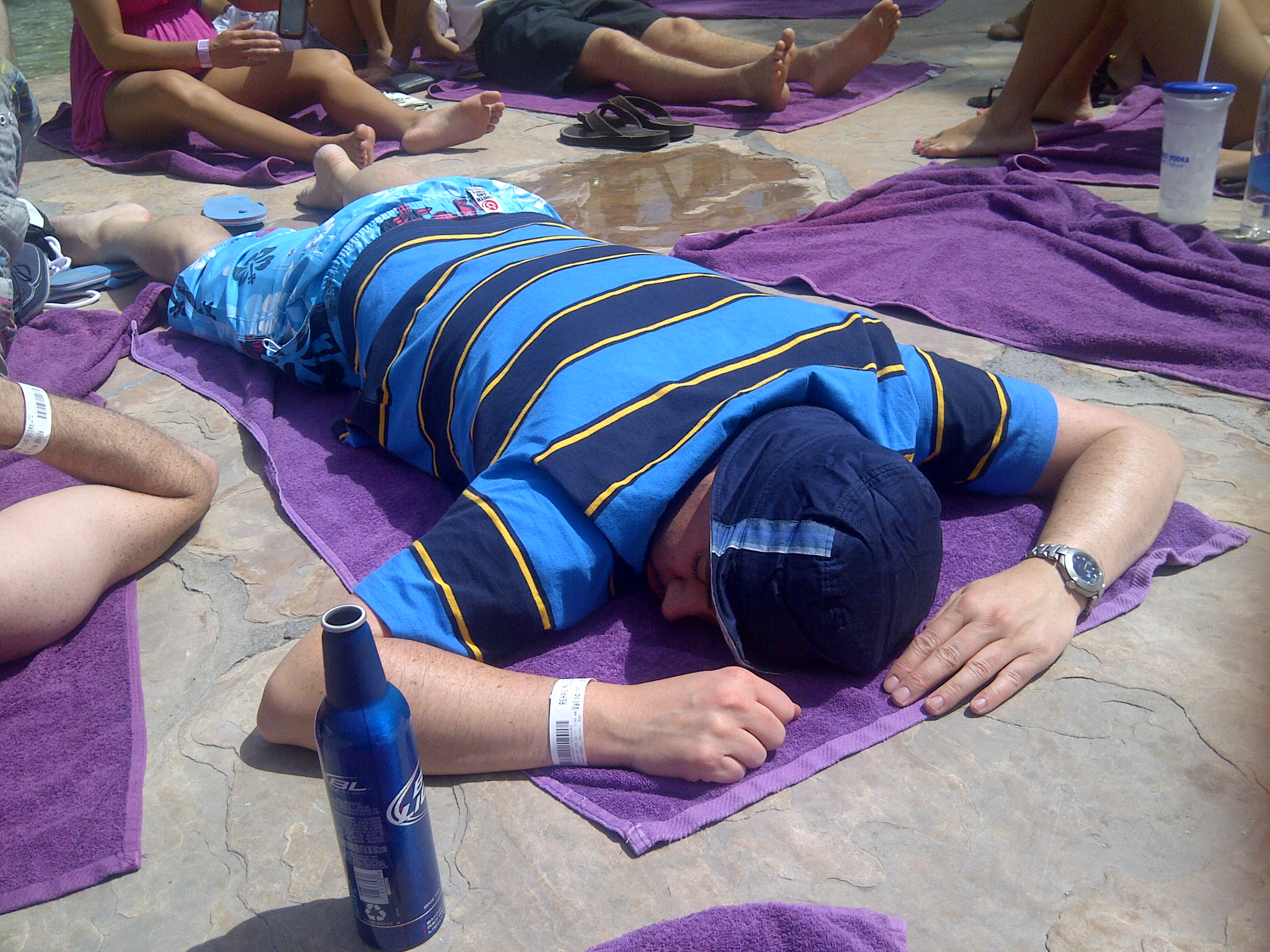 Anyway I met Paul and Kim and we start the process of checking in the pool (worst then the airport! Lot of things aren’t allowed). We get in at 10.30ish, waiting for the rest of the group to join us. Some people, knowing how crazy the line would have gotten, were smart enough to DRAG themselves from wherever they were and collapse few hrs on the floor before the party started, like this guy