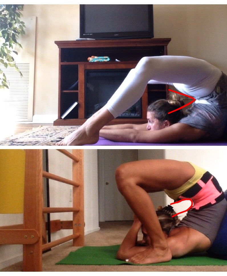 You can tell in the bottom picture, how the lower back is lifted and relieved from pressure, especially on S1-L5 joint, which is the joint connecting Sacrum to lowest lumbar vertebrae, while the thoracic area is more involved in the bend.