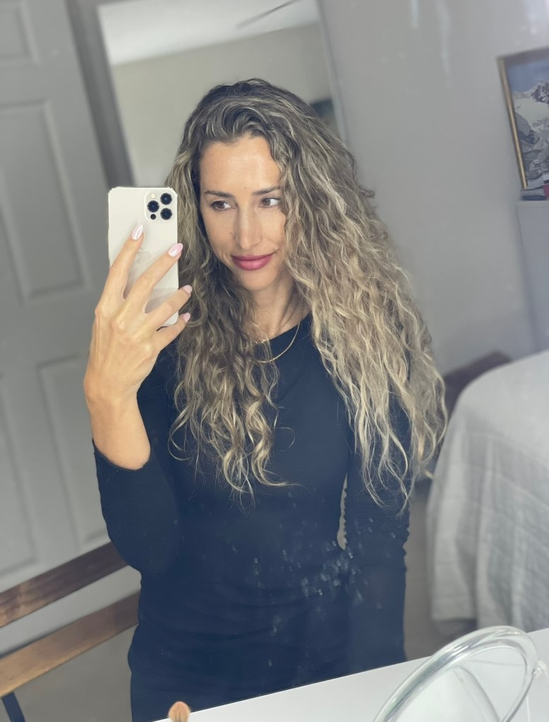 I tried to go back to my natural color BUT it’s quite dark (brown). I love the “beach hair look” so much, how the warm blonde goes well with my skin, how it lighten up my face. So to minimize damage (bleach, heat and hard water are the most damaging) I go get my color done by a trusted professional 1 -2 times a year and ask for balayage (lighter softer color going more toward the mids) or baby highlights (a finer version of highlights), which add dimension and mimic a sun kissed/beach look, without going full damage blonde. This way of coloring works for me and I don’t mind when I see dark growth at the top, it blends nicely with my waves while I let the hair recover and strengthen between appointments.